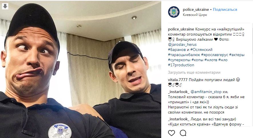 А девушка под ником blond_007_ пишет: "Какие у нас четкие комментаторы!!! Дай только повод кого-то обсудить и рассказать,что и кому делать) Люди это Ярослав Герус и Тарас Цимбалюк , они же Ослянский и Баранов из сериала "СуперКопы"!!!"