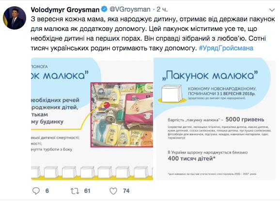 "С сентября каждая мама, которая родит ребенка, получит от государства пакет малыша. Он будет содержать все необходимое для ребенка на первых порах. Собран с любовью. Сотни тысяч украинских семей получат такую помощь", - пишет Гройсман.