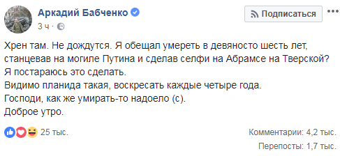 "Не дождутся. Я обещал умереть в девяносто шесть лет, станцевав на могиле Путина и сделав селфи на Абрамсе на Тверской? Я постараюсь это сделать. Видимо планида такая, воскресать каждые четыре года. Господи, как же умирать-то надоело" - написал он.