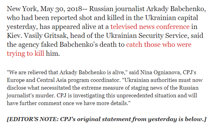 "Мы с облегчением узнали, что Аркадий Бабченко жив, - заявила координатор программы "Европа и Центральная Азия" Нина Огнянова. - Теперь украинская власть должна разъяснить, что побудило её к чрезвычайным мерам инсценировки новости об убийстве российского журналиста".
