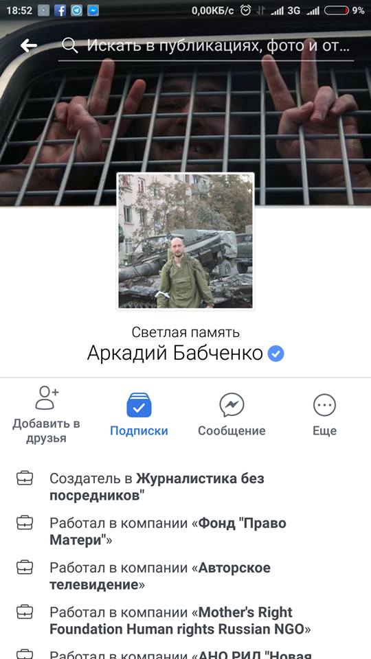 20:16  Из Facebook Бабченко исчезла метка "Светлая память". Она была там до последних минут.