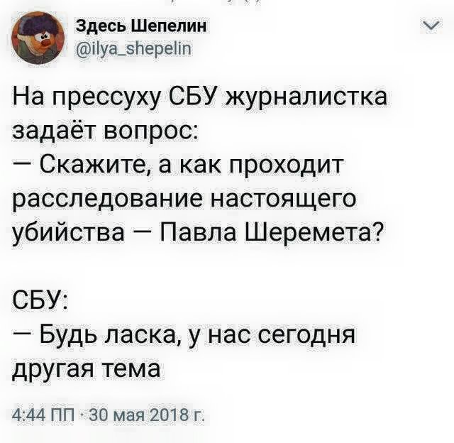 18:29  "Кто убил Шеремета?" - спрашивает в соцсетях журналист Сергей Руденко. Вопрос резонный. Раскрытие фейкового убийства не отменяет того факта, что настоящее остается "висяком".