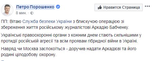 "Украинские правоохранительные органы с каждым днем становятся сильнее в противодействии российской агрессии и всем проявлениям гибридной войны в Украине. Вряд ли Москва успокоится - поручил оказать Аркадию и его семье круглосуточную охрану", - написал Порошенко.