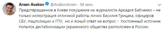 "Предотвращенное в Киеве покушение на журналиста Аркадия Бабченко – не только иллюстрация отличной работы лично Василия Грицака, офицеров СБУ, Нацполиции и ГПУ, но и ясный ответ на вопрос - постоянный источник попыток дестабилизации украинского общества расположен в России", - написал министр в своем микроблоге в соцсети Twitter в среду.