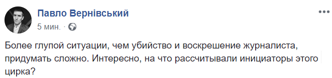 18:07  "Более глупой ситуации, чем убийство и воскрешение журналиста, придумать сложно. Интересно, на что рассчитывали инициаторы этого цирка?", - пишет блогер Павел Вернивский.