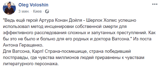 ""Ведь ещё герой Артура Конан Дойля - Шерлок Холмс успешно использовал метод инсценировки собственной смерти для эффективного расследования сложных и запутанных преступлений. Как бы это не было и больно для его родных и доктора Ватсона." Из поста Антона Геращенко.