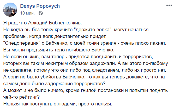 "С облегчением узнал, что Аркадий Бабченко жив! Я осуждаю решение распространять ложную информацию о жизни журналиста. Государство обязано предоставлять правильную информацию общественности",  - написал он в Facebook.