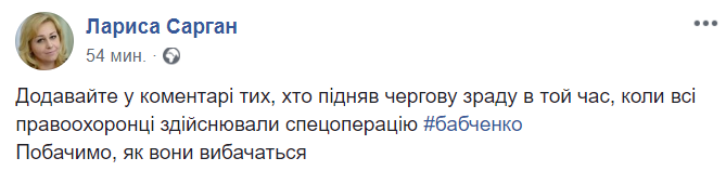 18:58  Пресс-секретарь Луценко Лариса Сарган решила создать "черный список" зрадофилов, которые посмели критиковать власть за "гибель" Бабченко. В посте, среди прочих, упомянуты Юлия Тимошенко и Amnesty International.