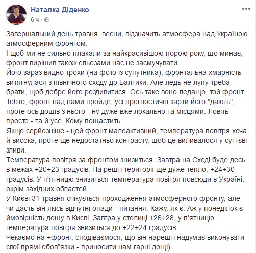 "Завтра на Востоке будет где-то в пределах + 20 + 23 градусов. На остальной территории еще очень теплее, + 24 + 30 градусов. В пятницу снизится температура воздуха повсеместно в Украине, кроме западных областей. В Киеве 31 мая ожидается прохождение атмосферного фронта, но даст ли он какие-то ощутимые осадки - вопрос. Завтра в столице + 26 + 28, в пятницу температура воздуха снизится до + 22 + 24 градусов. Ждем фронт, надеемся, что он наконец надумает выполнять свои прямые обязанности - приносить нам хорошие дожди", - написала она.