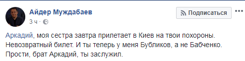 "Аркадий, моя сестра завтра прилетает в Киев на твои похороны. Невозвратный билет. И ты теперь у меня Бубликов, а не Бабченко. Прости, брат Аркадий, ты заслужил", - написал Муждабаев в ФБ.
