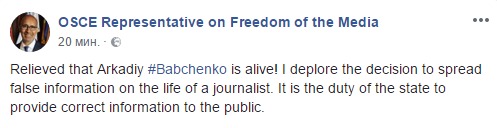 Представитель ОБСЕ по вопросам свободы СМИ Арлем Дезир, который вчера даже вылетел в Киев разбираться с убийством, сказал, что не одобряет фейк о Бабченко.