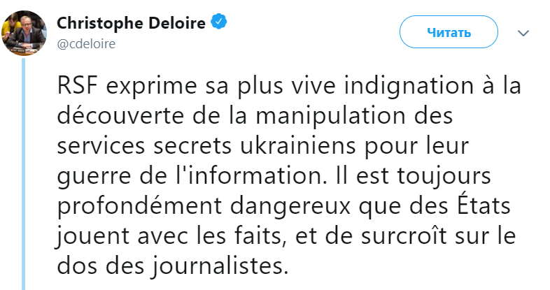 "Репортеры без границ" выражают свое глубокое возмущение после вскрытия манипуляции Службы безопасности Украины, сделавшей новый шаг в информационной войне. Всегда очень опасно для правительств играть с фактами и также использовать журналистов для фейковых историй", – говорится в сообщении на английском языке.