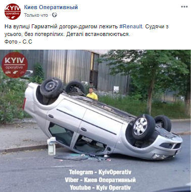 "На улице Гарматной вверх-ногами лежит #Renault. Судя по всему, без пострадавших. Детали устанавливаются", - говорится в сообщении в соцсети.