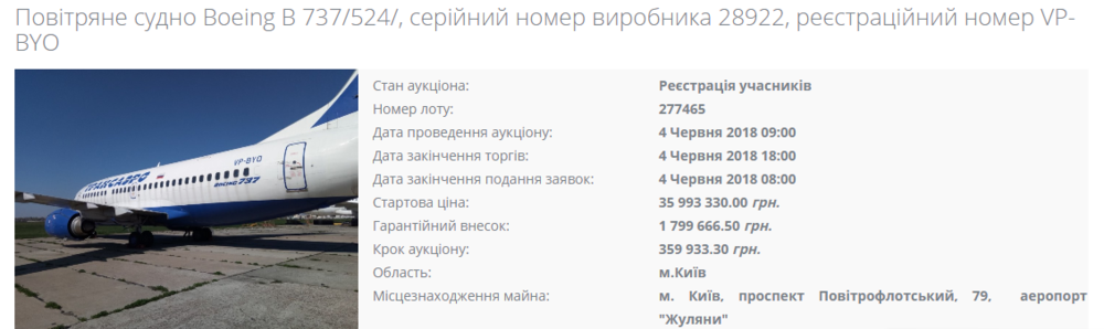 Регистрация участников для проведения аукциона проходит до 4 июня. Самолет находится в аэропорту "Жуляны".