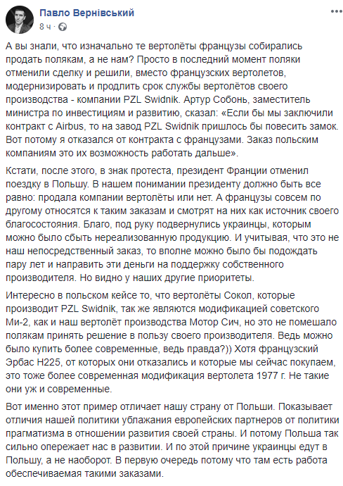"А вы знали, что изначально те вертолёты французы собирались продать полякам, а не нам? Просто в последний момент поляки отменили сделку и решили, вместо французских вертолетов, модернизировать и продлить срок службы вертолётов своего производства - компании PZL Swidnik. Артур Собонь, заместитель министра по инвестициям и развитию, сказал: "Если бы мы заключили контракт с Airbus, то на завод PZL Swidnik пришлось бы повесить замок. Вот потому я отказался от контракта с французами. Заказ польским компаниям это их возможность работать дальше".
