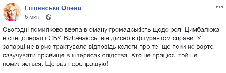 21:35  Спикер СБУ Елена Гитлянская, которая ранее отрицала, что Цимбалюк - провокатор и "киллер Бабченко", теперь это признала.