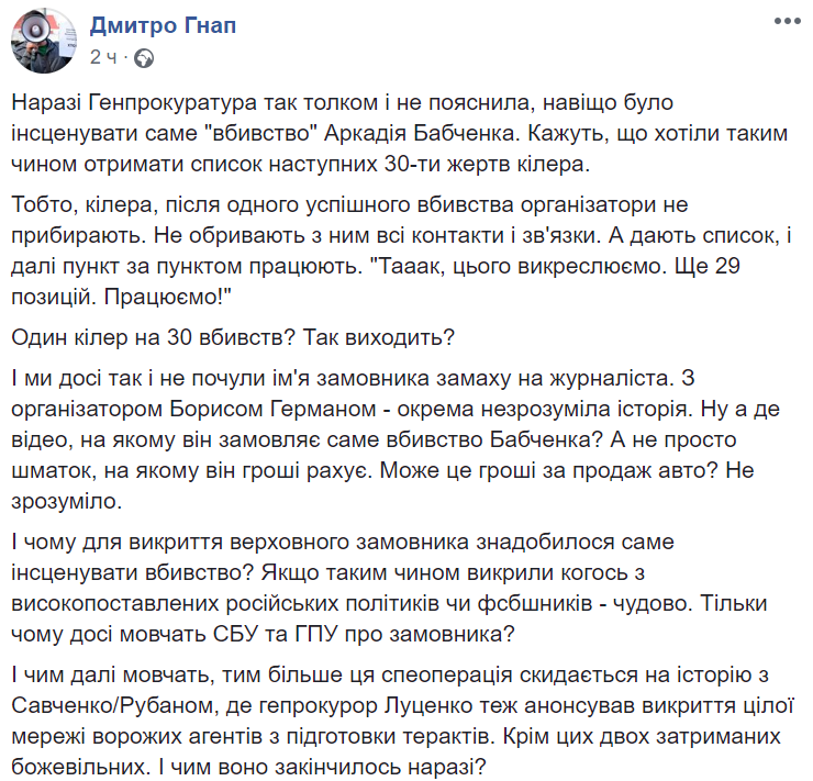 "Генпрокуратура так толком и не объяснила, зачем было инсценировать именно "убийство" Аркадия Бабченко. Говорят, что хотели таким образом получить список следующих 30-ти жертв киллера.