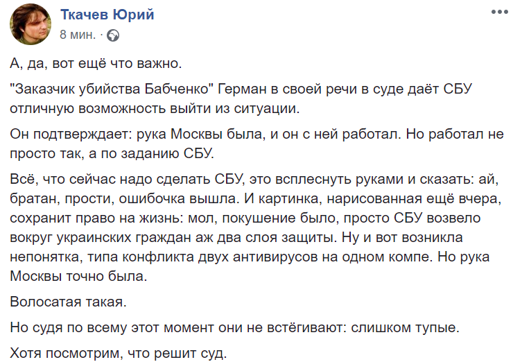 ""Заказчик убийства Бабченко" Герман в своей речи в суде даёт СБУ отличную возможность выйти из ситуации.