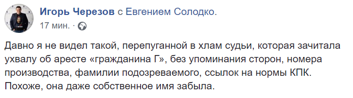 22:43  "Давно я не видел такой, перепуганной в хлам судьи, которая зачитала ухвалу об аресте "гражданина Г", без упоминания сторон, номера производства, фамилии подозреваемого, ссылок на нормы КПК.