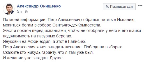 "По моей информации, Петр Алексеевич собрался лететь в Испанию, молиться богам в соборе Сантьяго-де-Компостела. Жест и поклон перед испанцами, чтобы не отобрали у него и его шайки недвижимость на лазурных берегах. Янукович на Афон ездил, а этот в Галисию. Петр Алексеевич хочет загадать желание. Победа на выборах.  Скажите кто-нибудь гаранту, что я там уже был. И желание уже загадал. Другое", - написал Онищенко.