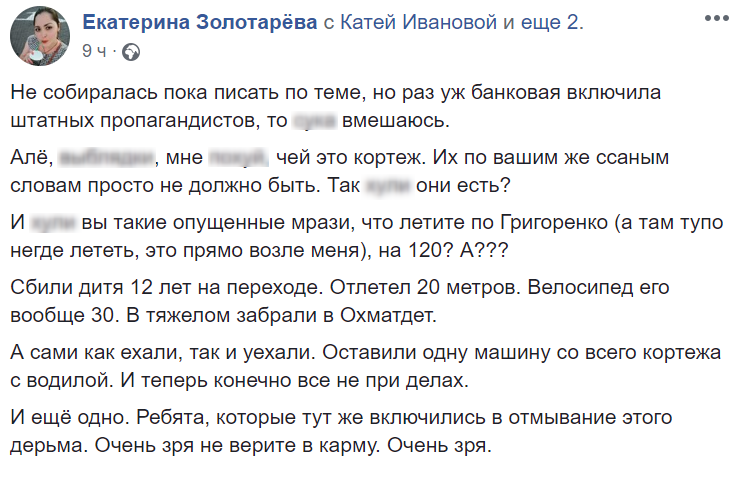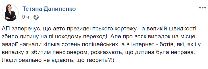 "АП отрицает, что авто президентского кортежа на большой скорости сбило ребенка на пешеходном переходе. Но на всякий случай на место аварии нагнали несколько сотен полицейских, а в интернет - ботов, которые, как и в случае со сбитым пенсионером, рассказывают, что ребенок был неправ. Люди реально не ведают, что творят?", - пишет в Facebook журналистка Татьяна Даниленко