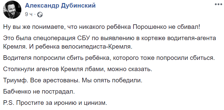 "Ну вы же понимаете, что никакого ребёнка Порошенко не сбивал!