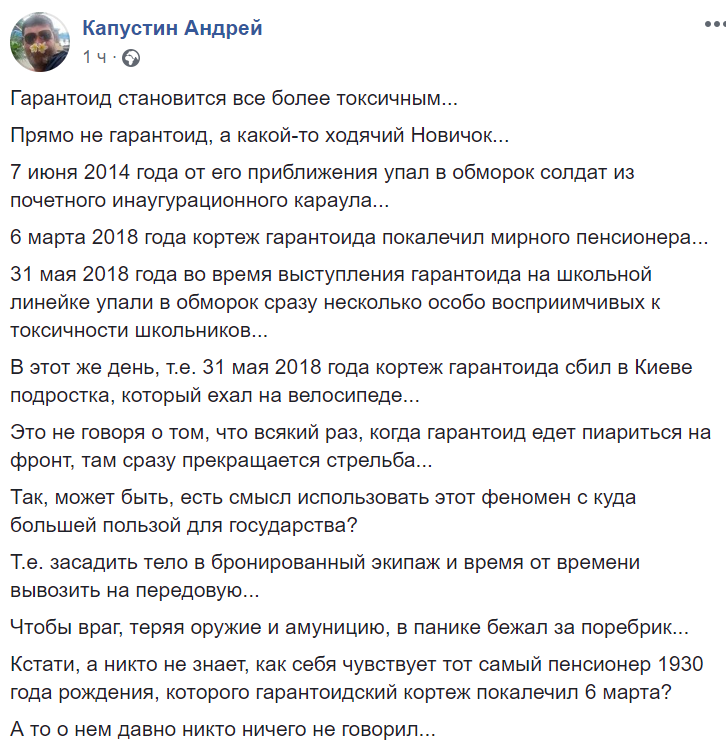 Это не говоря о том, что всякий раз, когда гарантоид едет пиариться на фронт, там сразу прекращается стрельба...".