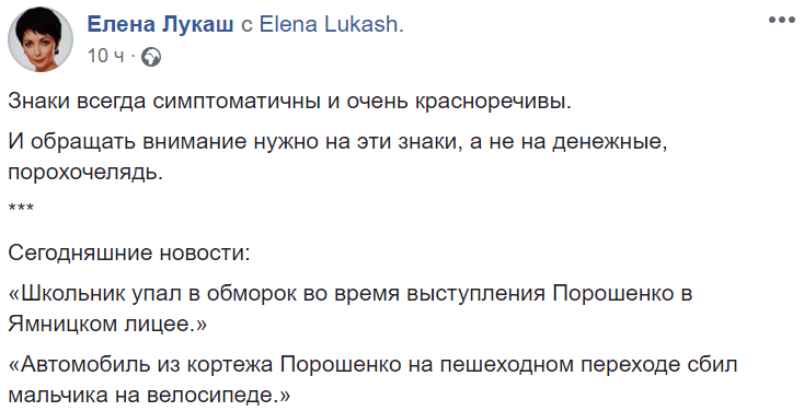 "Автомобиль из кортежа Порошенко на пешеходном переходе сбил мальчика на велосипеде."", - напоминает последовательность событий Елена Лукаш.