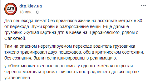 "Два пешехода лежат без признаков жизни на асфальте метрах в 30 от перехода. Лужи крови и разбросанные вещи. Еще дальше грузовик. Жуткая картина ДТП в Киеве на Щербаковского, рядом с Салютной", - говорится в сообщении.