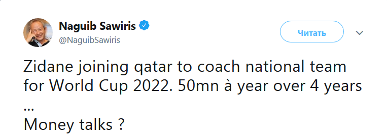 Египетский бизнесмен Нагиб Савирис в своем Twitter выдал сенсационную информацию, что Зидан возглавит сборную Катара, и будет ее готовить к домашнему чемпионату мира - 2022.