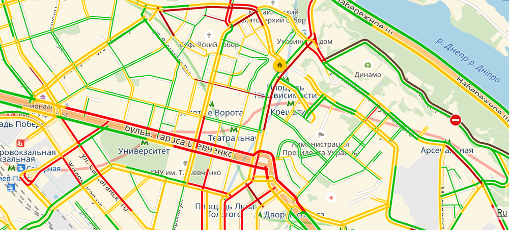 Движение затруднено в районе станций метро "Дружбы народов", "Олимпийская", "Университет", "Театральная", "Золотые ворота", "Контрактовая площадь", "Почтовая площадь" и других районов в центре. Об этом сообщают "Яндекс-пробки".