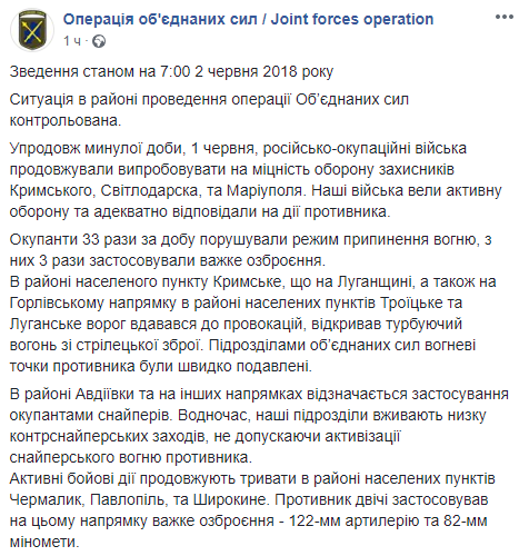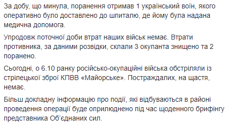 "В районе населенного пункта Крымское, что на Луганщине, а также на Горловском направления в районе населенных пунктов Троицкое и Луганское враг прибегал к провокациям, открывал беспокойный огонь из стрелкового оружия. Подразделениями объединенных сил огневые точки противника были быстро подавлены. В районе Авдеевки и на других направлениях отмечается применения оккупантами снайперов", - сказано в сообщении.