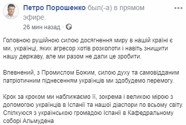 "Уверен, с промыслом Божьим, силой духа и самоотверженным патриотическим подъемом украинцев мы одержим победу. Шаг за шагом мы приближаем ее, в том числе и во многом с помощью украинцев в Испании и нашей диаспоры по всему миру", - говорится в сообщении.