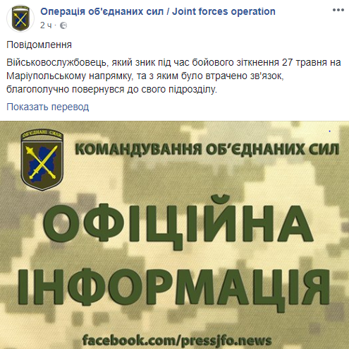 "Военнослужащий, пропавший во время боевого столкновения 27 мая на Мариупольском направлении, и с которым была потеряна связь, благополучно вернулся в свое подразделение", - говорится в сообщении.