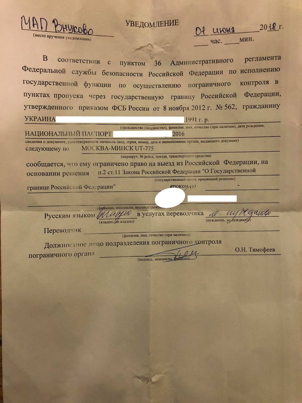 Документ о запрете на выезд, который вручили гражданке Украины в аэропорту "Внуково". Фото: "Страна"