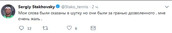 "Мои слова были сказаны в шутку, но они были за гранью дозволенного, мне очень жаль", – написал Стаховский в своем Twitter.