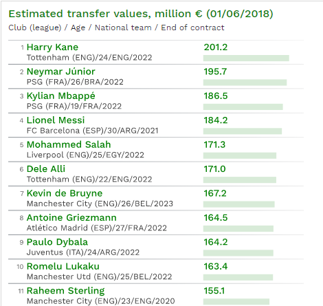 В десятку самых дорогих игроков также входят аргентинец Лионель Месси из "Барселоны", египтянин Мохаммед Салах ("Ливерпуль"), англичанин Делле Алли ("Тоттенхэм"), бельгийцы Кевин де Брёйне и Ромелу Лукаку (оба - "Манчестер Сити"), француз Антуан Гризманн ("Атлетико") и Паоло Дибала из Аргентины ("Ювентус").