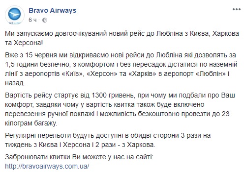 Украинская авиакомпания Bravo Airways с 15 июня открывает новые рейсы в Люблин из Киева, Харькова и Херсона. Стоимость перелета стартует от 1300 гривен, стоит отметить, что все тарифы включают возможность перевозки багажа весом до 23 килограмм.
