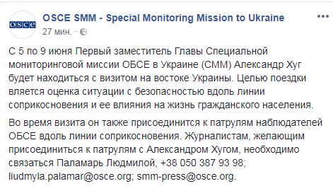 Во время поездки Александр Хуг намерен присоединиться к патрулям наблюдателей ОБСЕ вдоль линии столкновения.