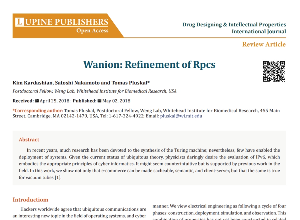 По словам Плюскаля, подобную работу было очень сложно опубликовать (она не проходила рецензирование), но затем он наткнулся на издание Drug Designing & Intellectual Properties International Journal, рецензенты которого приняли статью за четыре дня и не потребовали ни одной правки оригинального текста. Плюскаль "рекомендует DDIPIJ всем своим коллегам, особенно тем, кто тоже использует SCIgen".