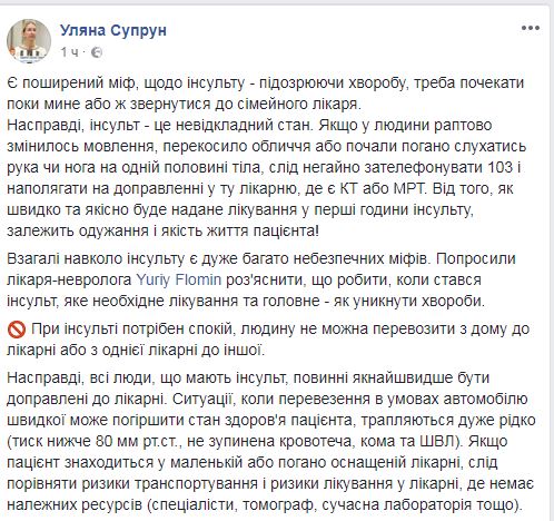 Так, она в Facebook опубликовала пост как избежать инсульта и как правильно себя вести, если он все-таки случился. А заодно развенчивает мифы об инсульте.