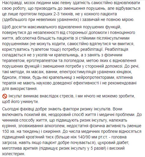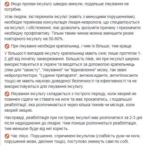 "В большинстве случаев инсульта капельницы имеют смысл лишь в течение 1-2 суток от начала заболевания. Большинство лекарств, которые при инсульте широко используются в Украине и вводятся при помощи капельниц (лекарство для "защиты", "лечение" или "восстановление" мозга, так называемые нейропротекторы, "сосудистые препараты, антиоксиданты, антигипоксанты и тому подобное) не имеют научно доказанной безопасности и эффективности и не используются для лечения инсульта", - пишет она.