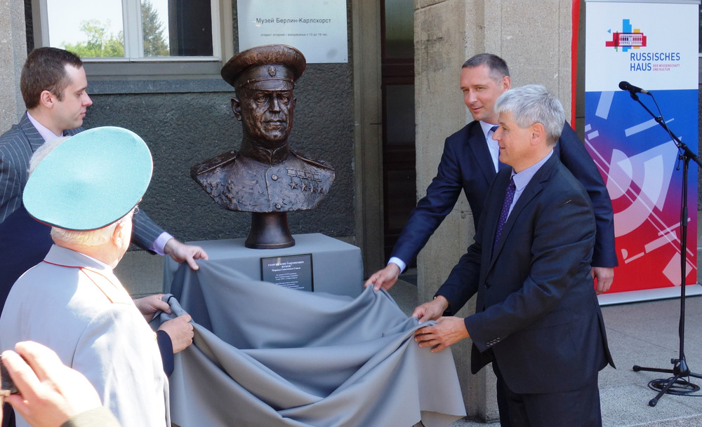 Бюст Жукову открыли в этом году 8 мая. На торжественной церемонии присутствовали чиновники из России и Германии, а также российские ветераны второй мировой войны. На церемонии выступал коллектив с русскими народными песнями.