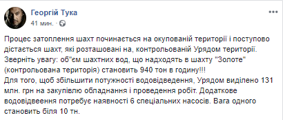 "Процесс затопления шахт начинается на оккупированной территории и постепенно достигает шахт, расположенных на контролируемой правительством территории. Обратите внимание: объем шахтных вод, поступающих в шахту "Золотое" (контролируемая территория) составляет 940 тонн в час", - написал Тука на своей странице в Facebook.