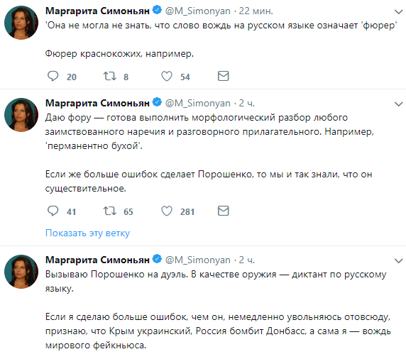 "Вызываю Порошенко на дуэль. В качестве оружия - диктант по русскому языку. Если я сделаю больше ошибок, чем он, немедленно увольняюсь отовсюду, признаю, что Крым украинский, Россия бомбит Донбасс, а сама я - вождь мирового фейкньюса", - написала Симоньян в Twitter.