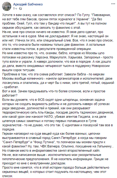 "Хотите я вам скажу, как составлялся этот список? По Гуглу. "Пивоварник, на вот тебе лям баксов, грохни пяток журналюг в Украине". "Да без проблем. Окей, Гугл, кто там у бандер что пишет". А вы тут на полном серьезе обсуждаете, как связать ту фамилию с этой. Не-не, мне про список ничего не известно. Я свое дело сделал, про остальное я не в курсе. Мне не докладывают. Я не знаю, настоящий он или нет. Утечка ли это, или специальный слив. Все, что я знаю про список, это то, что сначала были названы только две фамилии. А остальные стали известны потом, в результате проведенной операции.