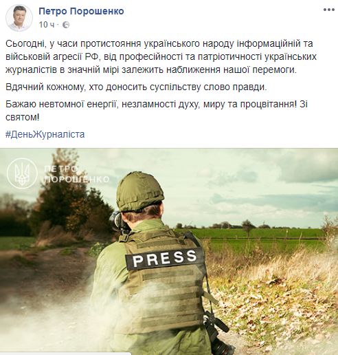 Президент Петр Порошенко в своем поздравлении написал, что патриотичные журналисты помогают приблизить победу в войне: "Сегодня, во времена противостояния украинского народа информационной и военной агрессии РФ, от профессионализма и патриотизма украинских журналистов в значительной степени зависит приближения нашей победы.