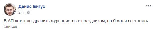 Журналист Денис Бигус также шутит на тему праздника и "расстрельного списка": "В АП хотят поздравить журналистов с праздником, но боятся составить список".