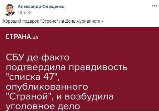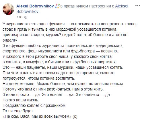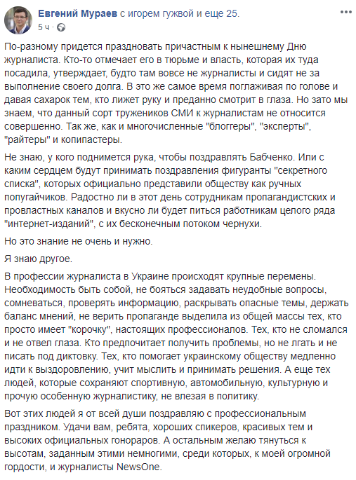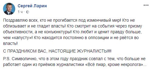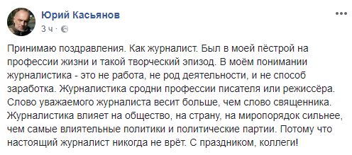 "Сегодня день журналиста и я присоединяюсь к многочисленным поздравлениям этим людям. Им очень непросто работать в наше время. Много вызовов и много соблазнов. Удобнее и выгоднее писать под заказ джинсу и посты в фейсбуке, чем добывать новости. Особенно неприятные для кого-то новости.