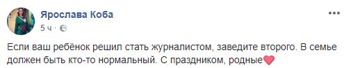 Журналист Ярослава Коба шутит: "Если ваш ребёнок решил стать журналистом, заведите второго. В семье должен быть кто-то нормальный. С праздником, родные"